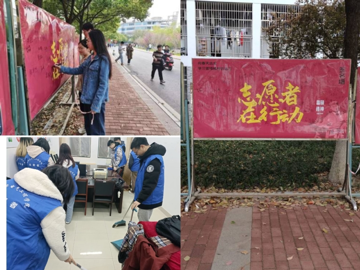 践行雷锋行动,用爱心续写雷锋故事。3月8日,学院学生会工作人员带领机电蓝马甲志愿者来到机电楼办公室开展义务劳动活动。大家相互合作,合理分工,积极配合,不怕脏不怕累,为创建文明卫生的机电楼贡献出自己的一份力量。3月21日,学院研究生成立志愿服务小组举办经验分享交流会帮助19级考研学生做好复试准备。他们结合自身考研复试经历,围绕联系导师、专业课备考、复试调剂和心态调整等方面进行了分享,现场答疑解惑。22级机械专业研究生胡基波同学说:“雷锋同志告诉我们一滴水只有放进大海里才永远不会干涸。在奉献和服务中生命才会有更大的价值和意义。考研的路上曾经有老师和学长无私的帮助过我们,我们也愿意传承这份奉献与爱心帮助学弟学妹。”学院在学校内安放“志愿者在行动”宣传板和签名板,呼吁同学们以实际行动践行雷锋精神。
