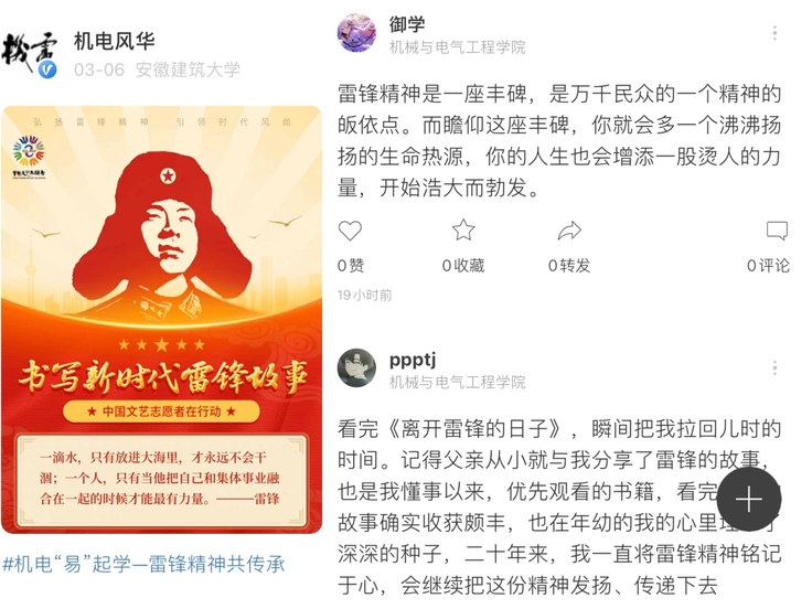 成立宣讲团,让有信仰的人讲信仰。学院学生党支部党员成立宣讲团,在党员活动日分享国内主流媒体关于雷锋精神的经典文章,弘扬雷锋爱党爱国的革命情怀,学习雷锋的爱岗敬业、刻苦专研、无私奉献和团结协作精神。支部党员在易班平台“机电‘易’起学——雷锋精神共传承”话题分享学习心得体会,畅谈雷锋精神与文化自信、雷锋精神与中国梦、雷锋精神与校园文化、雷锋精神与人生感悟、雷锋精神与新时代等焦点热点问题。