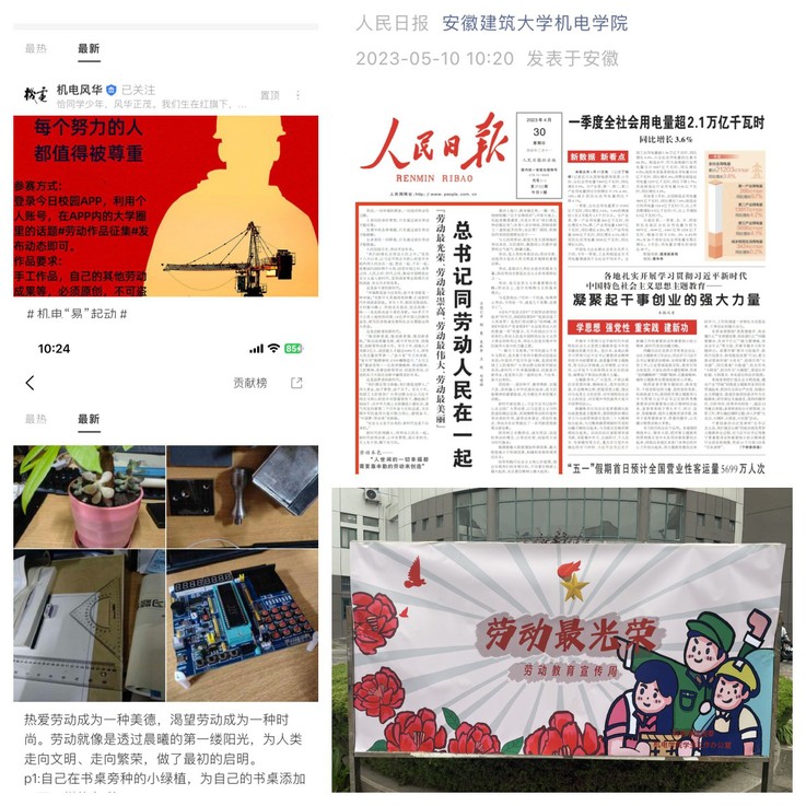 学院利用网络新媒体、海报等方式集中开展劳动教育宣传。向广大学生传播劳动知识,通过网络媒体宣传,引导广大学生树立正确的劳动观念,培养正确的劳动意识,鼓励同学们在日常生活学习中,要脚踏实地做事,勤于劳动,养成主动劳动、坚持劳动的良好习惯,在劳动中体现价值,展现风采。