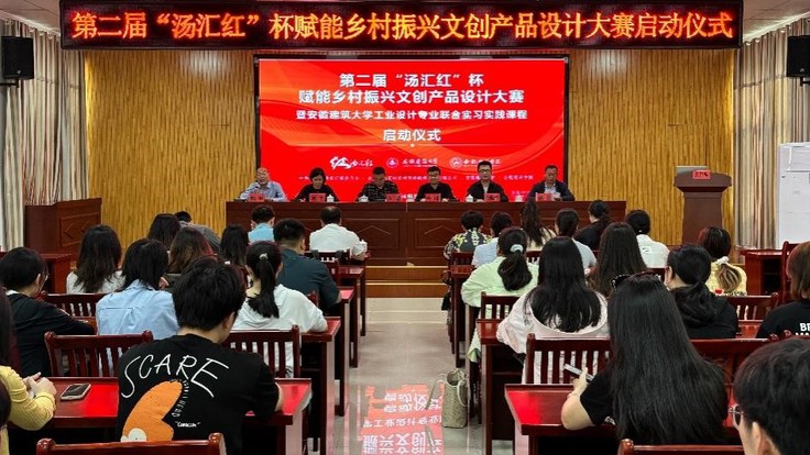 开幕式上,金寨县汤家汇镇党委书记叶甜致开幕词,鼓励师生以“红色、绿色、古色”文化为创作主题,整合汤家汇数字文旅资源和建大智库资源,提炼出具有现代感的设计创新,为乡村振兴注入新的动力。副院长黄磊在致辞中强调,将实习实践课程与汤家汇镇产业发展实际需求相合作,既是丰富教育教学形式的重要实践,也是推动地方文创产品设计的创新与发展,第一届大赛中十余件设计作品取得了良好的经济效益,希望本届大赛能为乡村经济发展与文化传承贡献更多的智慧和力量。