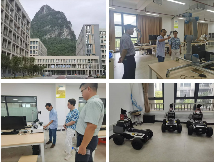 离开了广西大学,一行人马不停蹄的赶往桂林电子科技大学人工智能学院,就智能机器人专业建设情况展开深入调研。在调研过程中,双方就智能机器人专业的课程设置、实验室建设、师资队伍培养以及学生实践创新能力培养等方面进行了广泛的探讨,还参观了桂林电子科技大学人工智能学院的智能机器人实验室,了解了实验室的设备配置、科研方向以及学生实践情况。通过实地考察,调研团队对桂林电子科技大学在智能机器人领域的科研实力和教学水平有了更深入的了解。