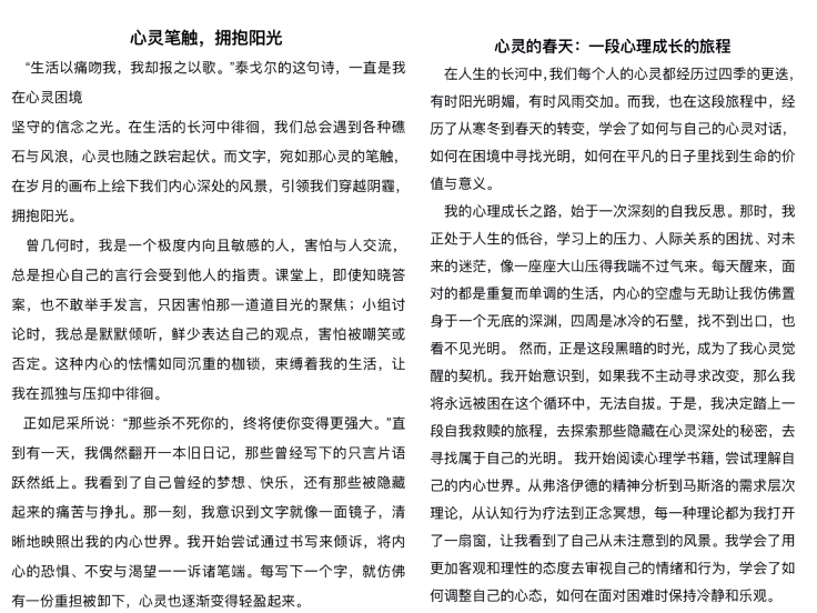 机电学院心理辅导站联合学院易班工作站举办“心灵笔触,拥抱阳光”心理征文比赛,旨在通过文字探索内心世界,传递积极心理能量。自启动以来,收到了大量创作者的投稿。参赛作品体裁丰富多样,涵盖记叙文、议论文、散文和诗歌等,它们紧扣心理健康主题,或讲述个人心灵成长历程,或分享应对生活挑战的感悟,或传递人际间的温情与力量,字里行间透露出对生活的热爱和对阳光心态的追求。