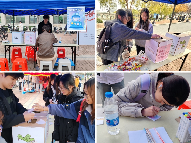12月4日,机电学院于紫云路校区北食堂门口举办“情绪盲盒”心理主题活动,活动场地设置了“情绪垃圾箱”和“快乐分享箱”两个情绪盲盒,同学们纷纷写下自己的快乐或者烦恼投入对应的盲盒之中,并且随机抽取盲盒中他人的纸条。在放入和拿取的过程中,成功搭建起一座连接内心世界与现实生活的桥梁,收获别人快乐的同时也在消化着心中的烦恼,引导同学们共同感受情绪释放。