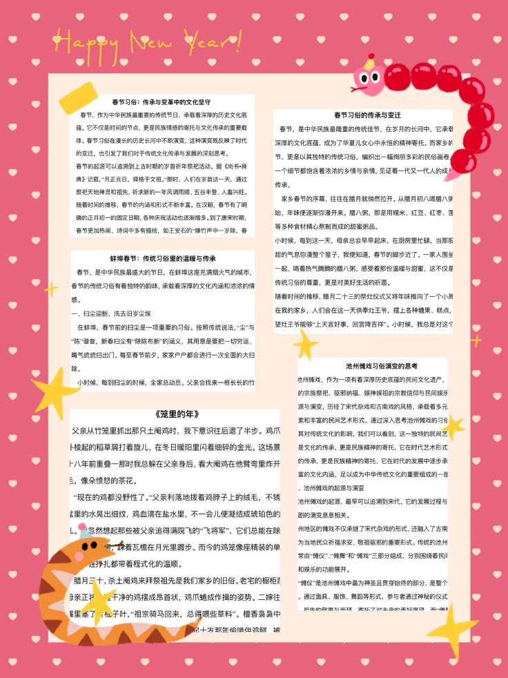文墨载乡情,家国共此时。家乡的习俗,是每个人心中最温暖的记忆。在“金蛇贺岁”家乡习俗征文活动中,同学们用文字讲述着家乡独特的春节习俗。从热闹非凡的庙会到温馨团圆的年夜饭,从寓意吉祥的拜年话到独具特色的传统手工艺,每一个习俗都承载着浓浓的家国情怀和深深的乡土眷恋。这些文章如同一幅幅绚丽的画卷,展现了我国地域文化的丰富多彩和中华文化的博大精深。通过分享与交流,同学们加深了对传统文化的理解和认同,感受到了家国情怀的强大凝聚力。