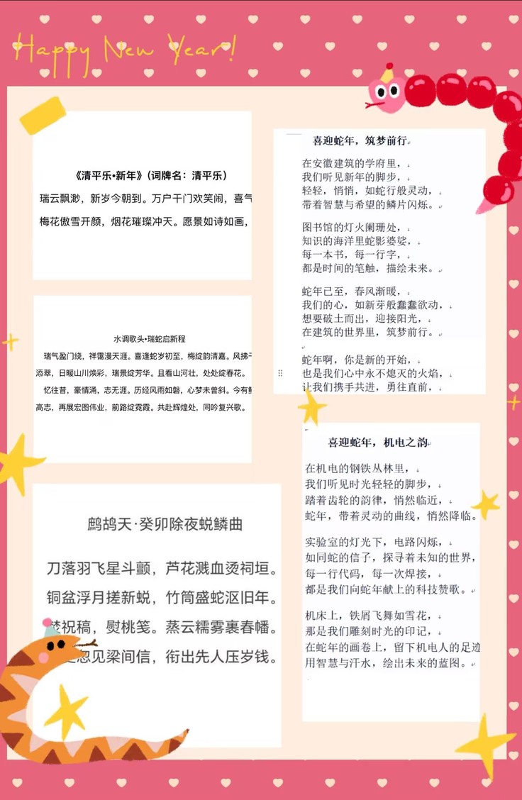 诗意绘新春,词韵咏家国。诗词,是中华文化宝库中璀璨的明珠。同学们以多元视角和细腻笔触共庆新春。他们或追溯春节习俗,勾勒年味醇厚的景致;或聚焦学院实验室与机床之畔,立志在蛇年镌刻机电人的奋斗足迹。更有才子以诗传情,祈愿母校新年更上层楼,成为追梦青年展翅高飞的沃土。这场诗词盛宴,不仅彰显了参赛者的文学才华,更为校园文化添上了绚烂的一笔,光彩夺目。