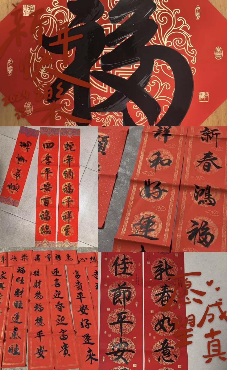 一笔一划绘新春,非遗文化润心田。书法,作为中华民族古老的非遗瑰宝,承载着千年的文化记忆。在“灵蛇妙笔”春联毛笔书法活动中,同学们手执毛笔,饱蘸浓墨,在红彤彤的春联纸上奋笔疾书。一横一竖,一撇一捺,都蕴含着对新年的美好期许和对家国情怀的深情寄托。一幅幅寓意吉祥的春联在笔下诞生,不仅传承了书法这一古老的非遗技艺,更让大家感受到了汉字的独特魅力和春节的浓厚氛围。
