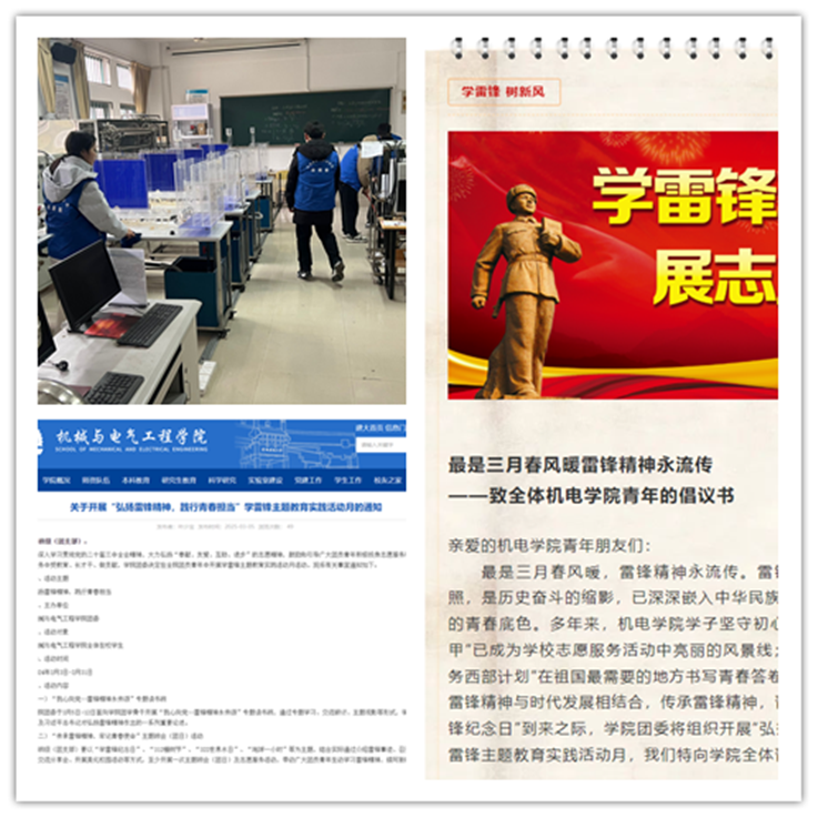 此次活动是学雷锋主题教育实践活动月的重要一环,在3月间,机电学院围绕“弘扬雷锋精神,践行青春担当”的活动主题,精心谋划了“我心向党--雷锋精神永传颂”专题读书班、“传承雷锋精神,牢记青春使命”主题班会(团日)活动、“我为同学办实事,文明美丽校园行”志愿服务活动、“寻找Z世代的雷锋精神”主题征文活动等六大实践活动模块,并向全院青年发布《最是三月春风暖 雷锋精神永流传——致全体机电学院青年的倡议书》鼓励和引导学院广大团员青年积极投身志愿服务事业,在志愿服务中受教育、长才干、做贡献。(文:王柏涛;一审:刘翔宇;二审:何鹤立;三审:叶少宝)