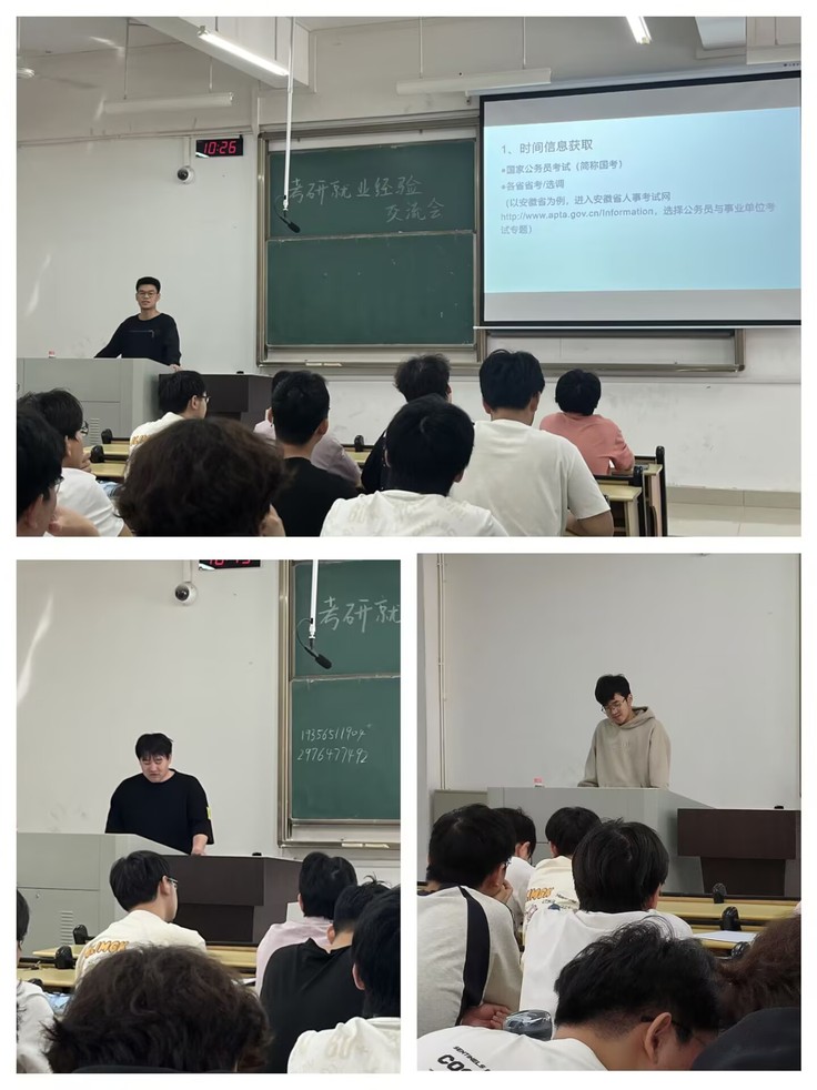 交流会上,陈天康以“三线并行”经历为切入点,分享了同时备考研究生、选调生及求职过程中时间管理与目标取舍的实战经验。杨群、曹赟雷则以上岸视角,详细拆解了考研院校选择、复习节奏把控及面试技巧等关键环节。在自由提问环节,同学们围绕“如何获取就业资讯”、“考研备考”等问题积极提问,学长们结合自身经历一一解答,现场气氛热烈。