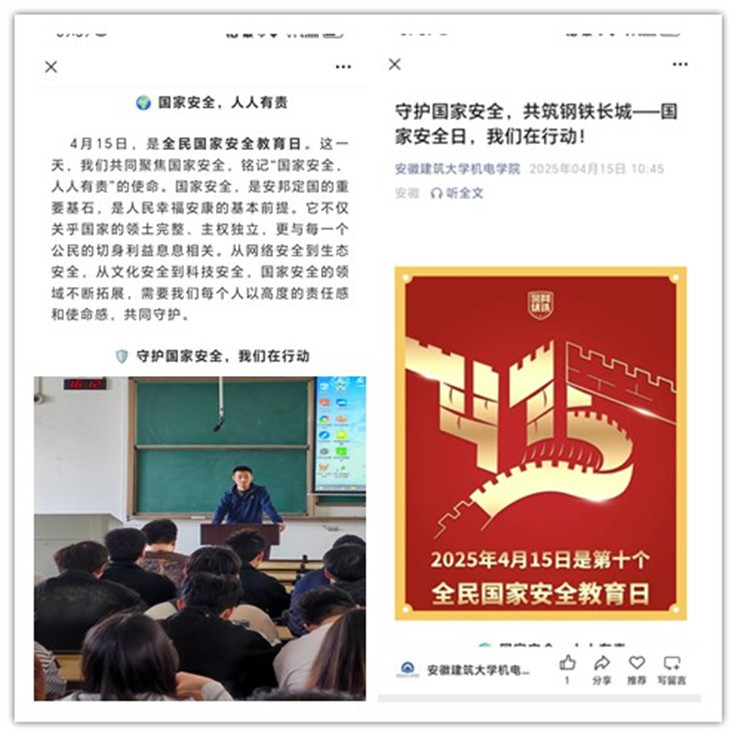 学院还充分发挥微信公众号等新媒体平台的传播优势,推送国家安全日主题文章、国家安全相关法律法规科普图文、以及生动有趣的普法宣传视频;通过图文并茂、通俗易懂的内容,向学生普及国家安全涵盖的多个领域知识。