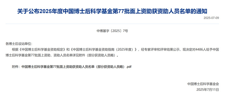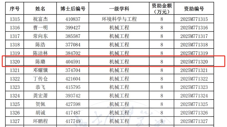 近日,中国博士后科学基金会发布了《关于公布2025年度中国博士后科学基金第77批面上资助获资助人员名单的通知》,机电学院博士后陈璐老师喜获第77批中国博士后科学基金面上项目资助。