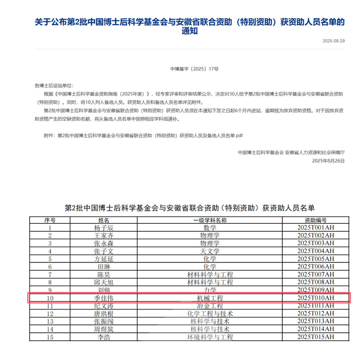 本网讯 近日,中国博士后科学基金会发布了《关于公布第2批中国博士后科学基金会与安徽省联合资助(特别资助)获资助人员名单的通知》,机电学院博士后季佳伟喜获第2批中国博士后科学基金会与安徽省联合资助(特别资助)。
