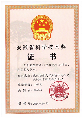 2013年编制了安徽省地方标准 《装配整体式剪力墙结构技术规程(试行)》(DB34_T 1874-2013)(早于国标),推动了合肥乃至安徽省装配式建筑发展的序幕。关键技术及系列成果 获得了安徽省科技进步二等奖。