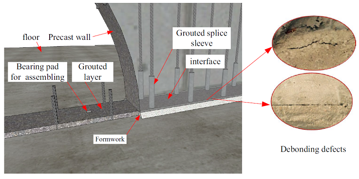 在装配式结构中,预制混凝土竖向构件之间的灌浆层需要承受高轴向压力,并在地震中承受较大的剪力。界面处的脱层缺陷可能会显著降低结构的安全性能,由于灌浆层通常存在于狭窄的空间中,检查灌浆层的质量,尤其是检测界面处的脱层是一项比较困难的任务。针对这一问题,团队提出了一种基于冲击回波理论的界面脱层检测方法(发明专利:ZL201711074920.8)并通过数值模拟和试验及现场盲测验证了该方法的可靠性。