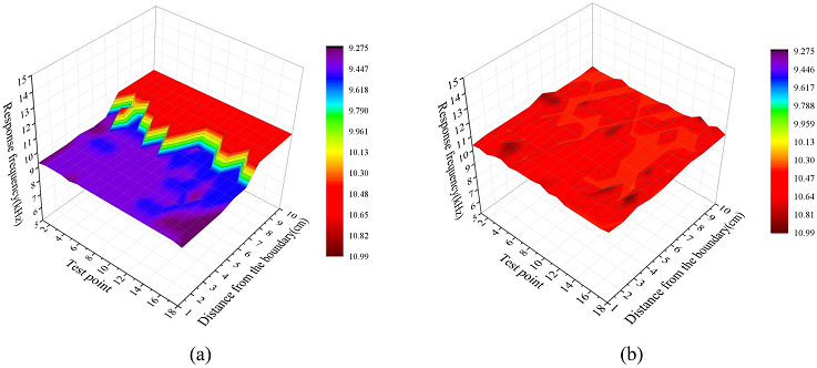冲击回波法是一种常见的无损检测方法,其基础是分析撞击点附近表面的反射瞬态应力波(尤其是纵波)的特性尤其是反射频率的变化来判断板厚或缺陷的位置。如果在界面上存在脱层缺陷,脱层处形成是混凝土/空气界面,其反射应力波频率会减小(图a);另一方面,如果灌浆层与墙体紧密贴合,应力波可以通过界面进行传播,反射波也会由于边界固结的影响而相对于板厚频率变大(图b),通过这一原理,可以有效地检验工程结构中是否存在脱层工程质量缺陷。
