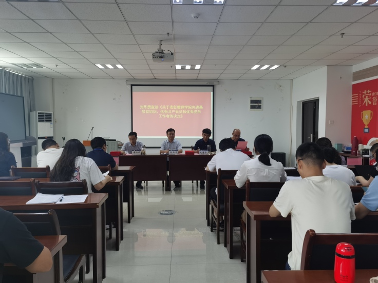 本网讯 为深入推进党纪学习教育,进一步激励广大党员干部踔厉奋发、不负韶华、再创佳绩。6月26日,数理学院在徽风楼1306会议室隆重召开庆祝中国共产党成立103周年暨“七一”表彰大会。学院领导班子成员、全体教师党员、学生党员代表、受表彰的先进党支部代表、优秀共产党员和优秀党务工作者参加会议。会议由学院副院长余江应主持。
