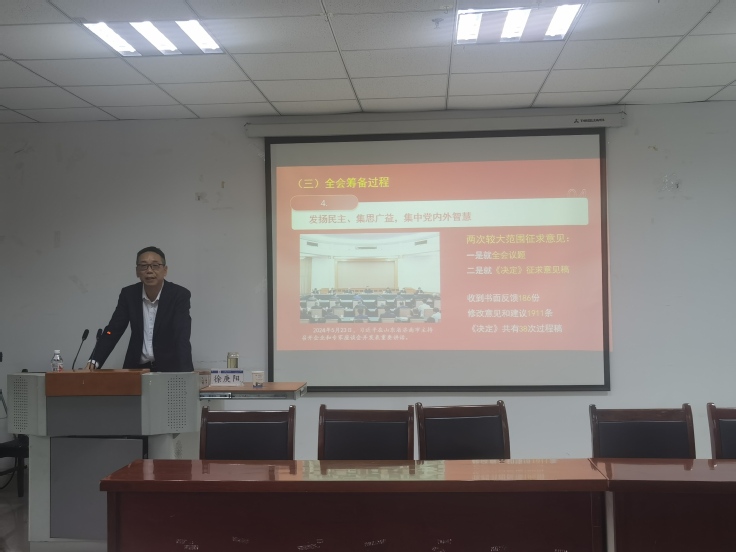 本网讯 为深入学习贯彻习近平新时代中国特色社会主义思想和党的二十届三中全会精神、全国教育大会精神、省委十一届七次全会精神,推动全会精神入脑入心、走深走实,10月17日,数理学院于徽风楼1306会议室举办学习贯彻党的二十届三中全会精神专题辅导报告会。会议邀请校党委常委、宣传部部长徐庚阳作“学习宣传贯彻党的二十届三中全会精神,进一步全面深化改革,推进中国式现代化”的专题报告,学院党政领导班子、各党支部支委成员、部分师生党员参加会议。