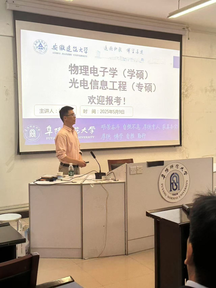 本网讯 为加强研究生培养质量和校际学术交流,5月9日,数理学院光电信息工程学科点负责人徐金荣副教授,赴阜阳师范大学物理与电子工程学院开展光电信息工程与物理电子学专业研究生招生宣传工作。阜阳师范大学物理与电子工程学院党委书记吴学军主持宣讲会,学院相关专业师生代表参加此次活动。