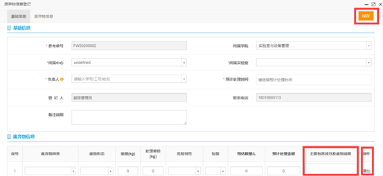 3.详细填写废弃物信息,尤其是有害成分一栏。多种类型废弃物填写时,可选择“增加”进行添加。填写完成后点击保存。