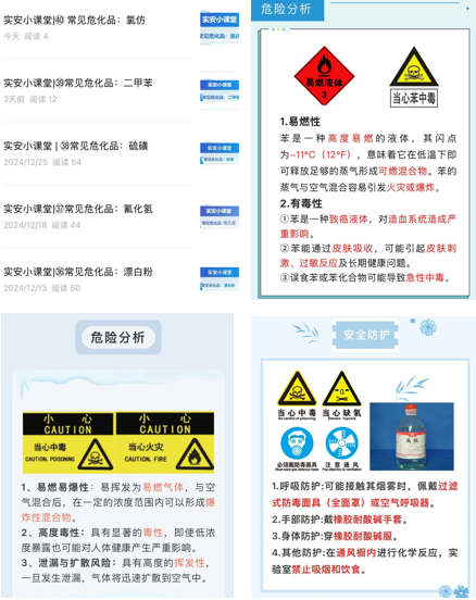 创新教育方式。利用“安建大实验室”微信公众号传播安全知识,开设“实安小课堂”专题栏目,以简洁形式推送危化品安全知识40余篇,从基本信息、危险分析、安全防护、安全存储等方面深入浅出进行科普教育。