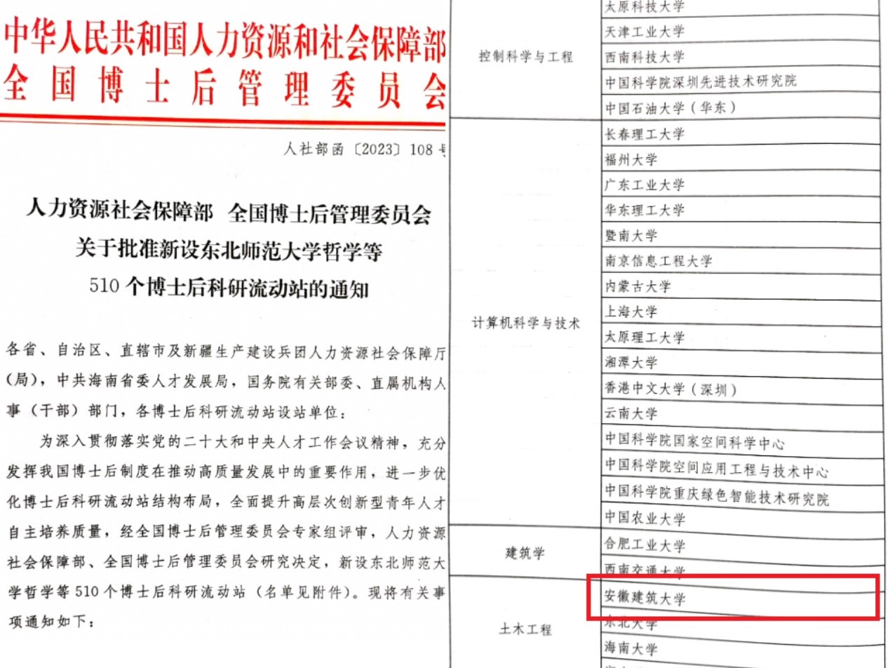 本网讯 近日,人力资源社会保障部全国博士后管理委员会下发《关于批准新设东北师范大学哲学等510个博士后科研流动站的通知》,必赢76net线路官网土木工程博士后科研流动站成功获批。 这是必赢获批的首个博士后科研流动站,是学校落实人才强校战略的重大成果,标志着学校学科建设取得新的突破。对进一步加强学科建设、培养高层次人才、打造高水平科研团队、推动标志性科研成果产出和创造高价值社会服务,助力学校建设国内一流、特色鲜明的高水平建筑大学具有重要意义。 近年来,学校紧密依托“大土建”学科优势,围绕国家新型城镇化和区域经济社会发展需求,大力加强学科专业建设,形成了结构合理、优势突出、特色鲜明、多学科协调发展的学科体系。土木工程学科是学校传统特色优势学科、安徽省高峰学科,形成了岩土工程、结构工程、市政工程、土木工程材料四大特色学科方向,拥有包括国家级人才在内、具有丰富科研经验和较深学术造诣的教科研团队,承担国家重点研发计划、国家杰出青年科学基金等多项国家级项目,建有建筑健康监测及灾害预防技术国家地方联合工程实验室、智能地下探测与环境岩土安徽省工程研究中心、建筑结构与地下工程安徽省重点实验室等多个先进实验室和科研平台,能够较好地满足博士后人才开展高水平科研,为其提供良好的条件和支持。 博士后科研流动站的设立,将进一步推进学校高层次人才引育、人才培养、科学研究、学科建设等方面工作取得更大成绩。下一步,学校将认真贯彻人力资源社会保障部、全国博士后管理委员会及安徽省关于博士后科研流动站建设相关政策,全力做好博士后科研流动站建设工作,加大博士后招聘力度,提高博士后培养质量和工作服务水平,进一步加强高水平青年人才队伍建设,优化师资队伍结构,为学校高质量发展注入新的动力。(文:侯奎;审核:潘和平)