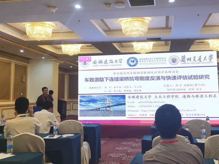 土木学院道桥系周宇副教授应邀做题为“车致激励下连续梁桥抗弯刚度反演与快速评估实验研究”的学术报告,卢恋博士做题为“基于分数阶Fourier变换的移动荷载激励下桥梁损伤识别研究”的学术报告,两个报告展示了土木学院在车桥耦合理论及应用领域的前沿探索,得到了与会专家学者的广泛关注。 闭幕式上,杨永斌院士呼吁加强跨学科合作以应对复杂环境下的工程挑战,并宣布“第五届全国车桥耦合振动及其应用学术研讨会”将于2027年在成都召开,由西南交通大学主办。本届研讨会不仅为学术界与工程界搭建了交流平台,更彰显了我国在车桥耦合领域的科研实力与工程应用水平,为交通强国建设注入新的动能。(文/图:周宇、卢恋;一审:叶训,二审:陈东,三审:王媛) |
