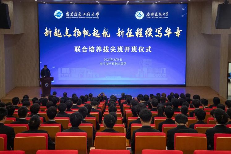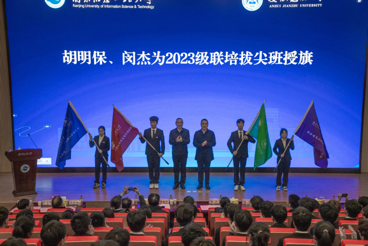 本网讯 3月6日下午,必赢76net线路官网-南京信息工程大学2023级联合培养拔尖班开班仪式在滁州天长金牛湖产教融合园区千秋会堂举行。校党委常委、副校长闵杰,南京信息工程大学党委常委、总会计师胡明保出席仪式,并为2023级拔尖班授旗,学校长三角区域高等教育一体化示范区共建办公室、学生工作部、教务处、电子与信息工程学院、机械与电气工程学院负责人,南京信息工程大学相关职能部门与学院负责人,金牛湖园区管委会有关负责人,以及2023级联培拔尖班112名同学参加开班仪式。