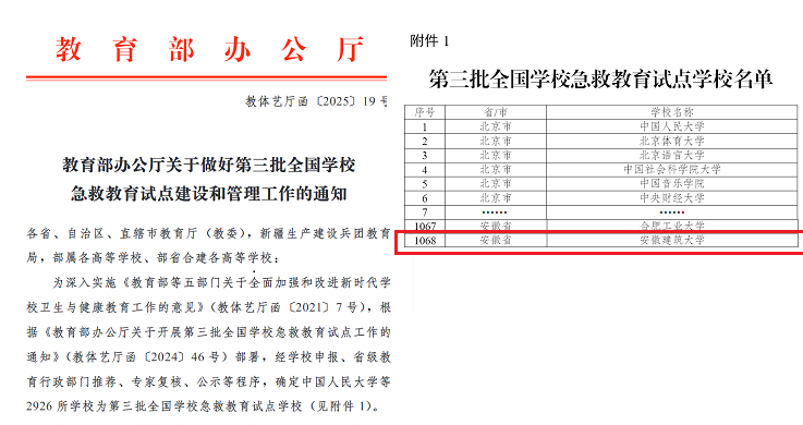 本网讯 2025年必赢积极申报第三批全国学校急救教育试点单位。经过学校申报、合肥市教育局评审公示、省教育厅推荐等程序,近日,教育部办公厅下发《关于做好第三批全国学校急救教育试点建设和管理工作的通知》,必赢76net线路官网获批试点单位。