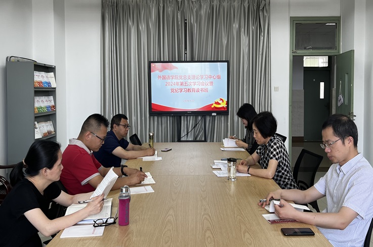 本网讯 5月22日,外国语学院党总支在徽学楼1714会议室举行理论学习中心组第五次扩大会议暨党纪学习教育读书班,会议由学院党总支书记余鸿主持,学院党总支委员、各党支部书记参加会议。