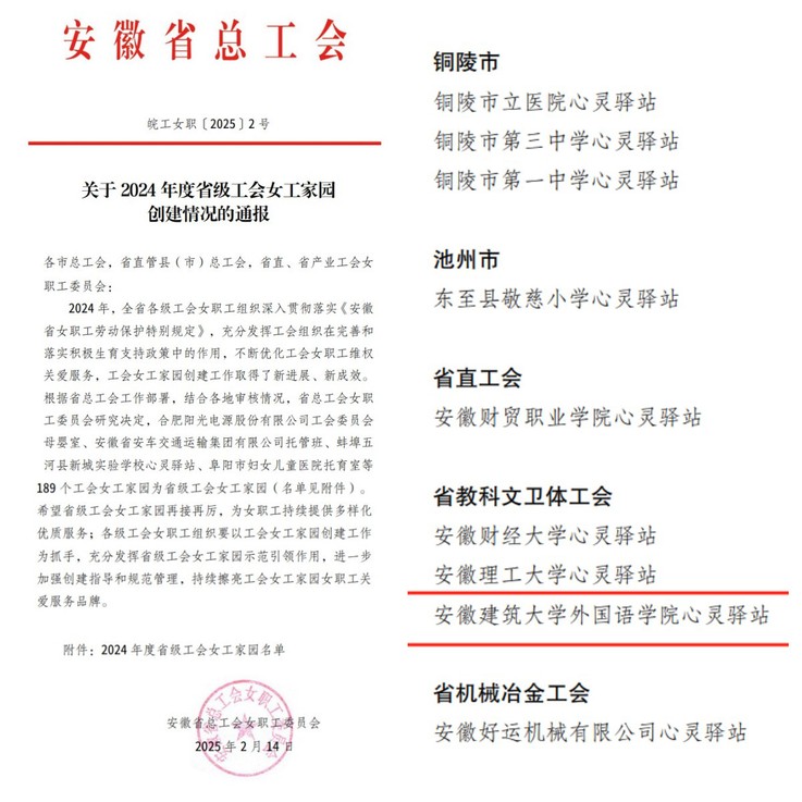 本网讯 近日,安徽省总工会公布了关于 2024 年度省级工会女工家园创建情况,必赢外国语学院心灵驿站成功获批省级女工家园心灵驿站。这一荣誉不仅是对学院工会工作的充分肯定,也为进一步提升教职工心理健康服务水平提供了有力支持。
