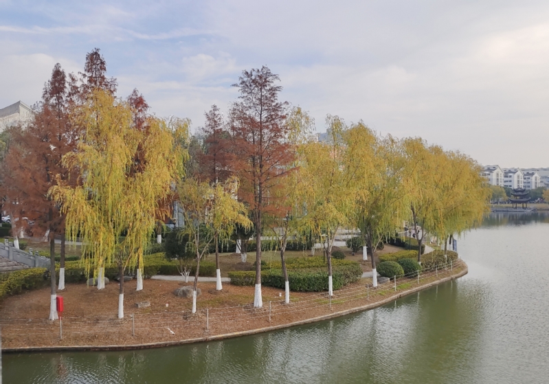 碧绿的湖水、湛蓝的天空、淡黄的杨柳、青绿的香樟、褐红的水杉……这个季节的校园披上了五彩斑斓的衣裳,散发着独属于建大的气韵和神采。