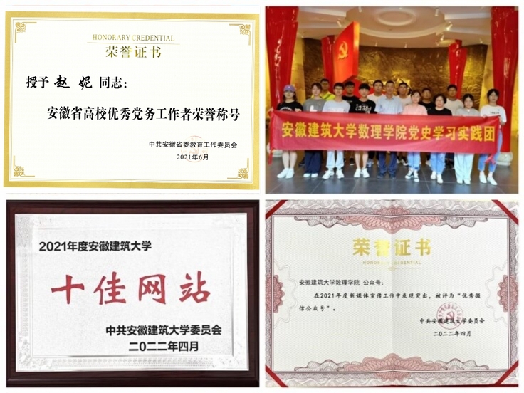 一是率先垂范立标杆。五年来,刘华勇等6名教师党员获得安徽省数学建模优秀教师,严飞等10名教师党员获得省级“教坛新秀”。疫情期间,教师党员李璐深入研究线上教学,建立完善《线性代数》网络课程体系,获得安徽省“线上教学名师”、“卓越教坛新秀”、校“优秀共产党员”荣誉称号。学生党员潘应浩专业知识扎实、创新创业能力强,先后获得“2019年度安徽省大学生年度人物”、安徽省“优秀大学生”、安徽省“创新创业好青年提名奖”和“勤学上进好青年提名奖”等荣誉称号。