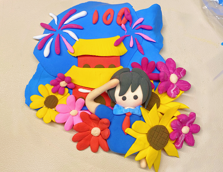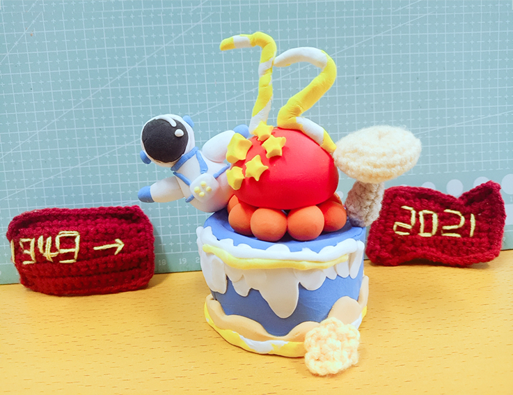 艺术学院同学围绕国庆主题,以黏土、毛线、绒布等材料为基础真诚的爱国热情与拳拳赤子之心融入手工作品的创作之中,以组合拼贴、平面浮雕等多元化的艺术表现手法在方寸之间浓缩举国欢庆的盛况,在掌中天地里展现中华盛世的大好河山,抒发青年学子们胸中的“中国情”