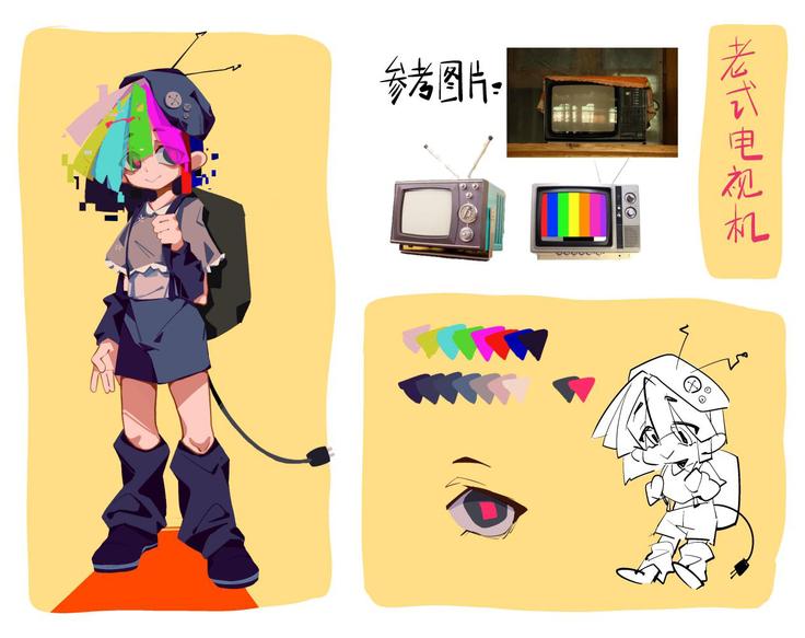 22级动画专业的孙玮珩将老式电视机设计成孩童模样,电视机高饱和的彩色花屏化为头发,标志性的厚重后盖成为背上的双肩包,里面放置的是支持其工作的电线与电路板。如今,各式各样的高科技智能家电已然“飞入寻常百姓家”,曾经的老电视上闪烁着的雪花点与五彩斑斓的色块已成为了大家的回忆。