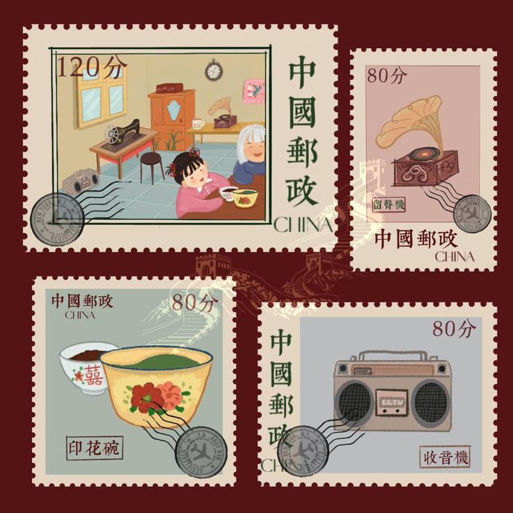 21环境设计专业许烨的作品《寻觅·时光》以留声机、收音机以及印花陶瓷碗为主题,设计了系列主题邮票,以北京长城作为邮票的印花钢印,画面整体以红色作为背景色调,更显庄重典雅。如今,人们家中的物件早已更新换代,这些在邮票中描绘的老物件也逐渐成为了记忆中留存的文化符号。这一从实物到符号的变迁过程既是一代人的回忆,也是人民生活水平蒸蒸日上的表现之一。