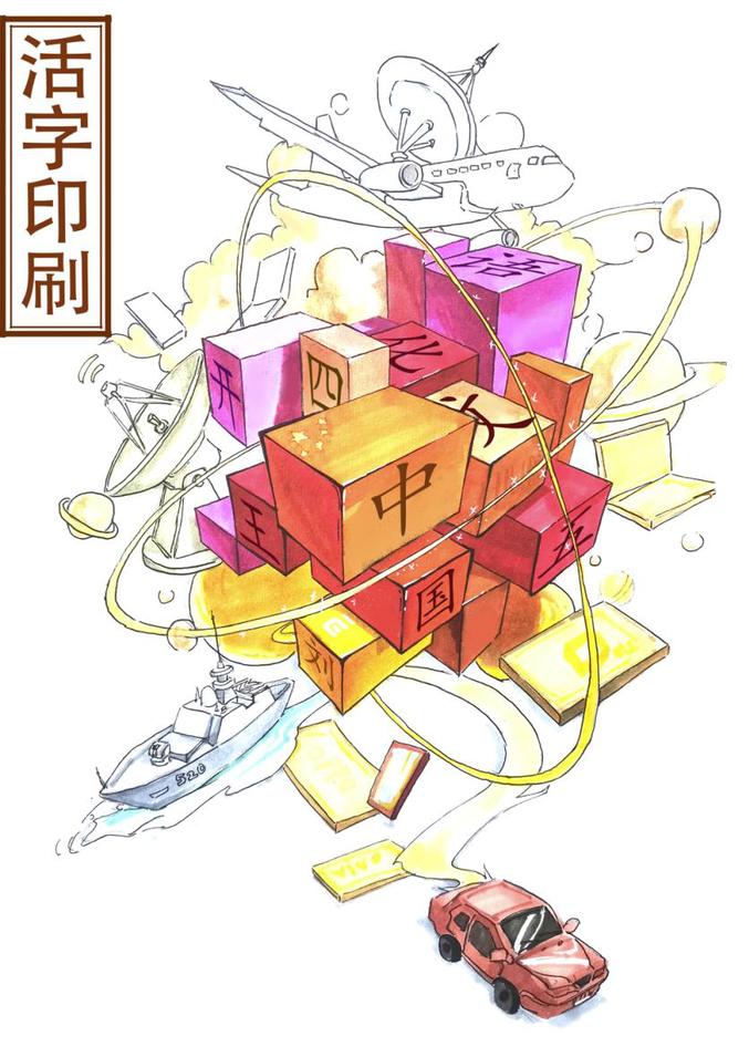 21动画专业牛子牧将活字印刷中的单字通过创意的方式展现出来,与现代科技相结合,体现中国文化多年风雨历程的变化。