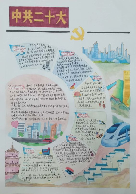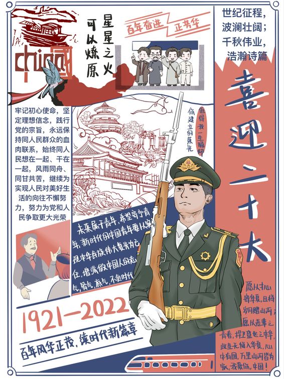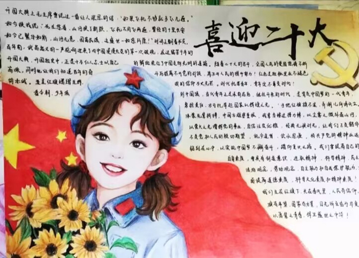 同学们利用彩铅、马克笔等创作工具,采用速写、色彩、素描等绘画方式,以报纸为创作载体,详细展示了自中共一大以来到二十大中国共产党带领中国人民向着伟大复兴不断前进的光辉征程。