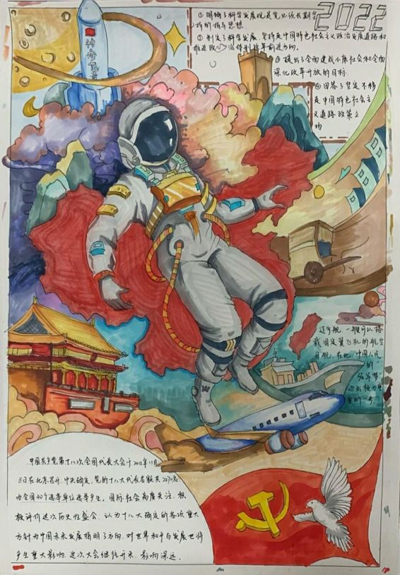 21级环境设计中外专业的赵雨璇同学选取了“‘辽宁舰’试航成功”、“航空航天事业再创新高”等作为画面构图的主题部分,介绍了中国人民在中国共产党的领导下取得的辉煌成就,展现了中华民族奋勇向前、敢为人先的奋斗精神。