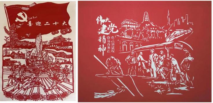21级视觉传达设计焦德平以二十大为主题,用剪纸艺术刻画展现了中华民族的团结富强和青年人的朝气蓬勃,满怀对祖国光辉未来的期待。20视觉传达设计张海玲以剪纸方式描绘了人民美好生活,宣传伟大的建党精神,坚定不移地拥护中国共产党的领导,共同开创美好新时代。