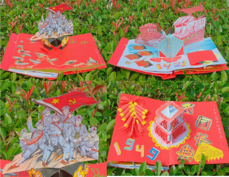 22级环境设计专业丁田田制作的立体书,以卡纸水彩笔为材料,将红船精神、长征与开国大典党史故事等主题融入立体书之中,表达了青年大学生对祖国的热爱,表达了生在红旗下、长在春风里的自豪与骄傲。