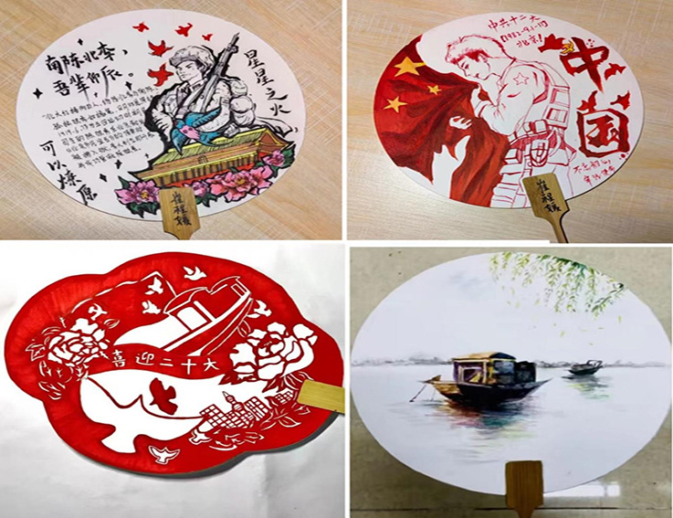 22级公共艺术专业崔程媛以扇面绘画的形式歌颂了伟大的历史英雄,鼓励广大青年向英雄学习,为人民服务,为国家奋斗;21级环境设计中外专业的卢一帆以红船精神为创作主题,将南湖画舫绘于扇面之上,描绘了中共一大召开现场的场景,赞颂了这一中国革命史上开天辟地的大事件。