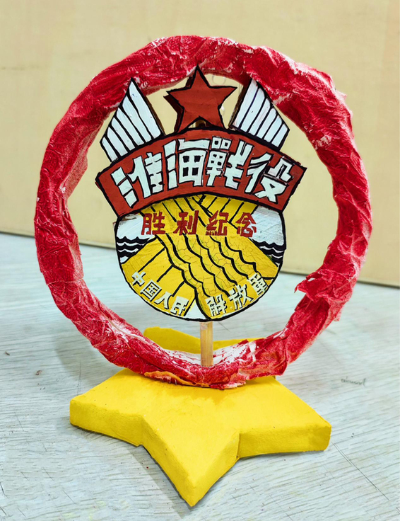 22级视觉传达专业丁嘉豪、赵乐以淮海战役纪念章为创作原型,设计了淮海战役主题纪念纸模。展现人民与军队的鱼水情,纪念淮海战役的伟大胜利,时刻不忘坚持群众路线,不忘为人民群众服务的初心与使命,始终牢记要从群众中来,到群众中去。