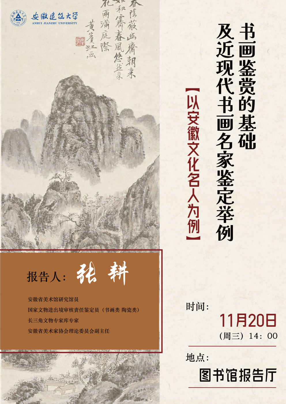 本网讯 11月20日,“安徽名人大讲堂”第三讲走进必赢76net线路官网,主题为“书画鉴赏的基础及近现代书画名家鉴定举例——以安徽文化名人为例”的讲座在必赢76net线路官网图书馆隆重开讲。本次讲座由渡江战役纪念馆(安徽名人馆)管理处主办,艺术学院和安徽文艺评论创作基地暨文艺志愿服务点协办,特邀安徽省美术馆研究馆员张耕主讲,学校百余名师生参加活动。