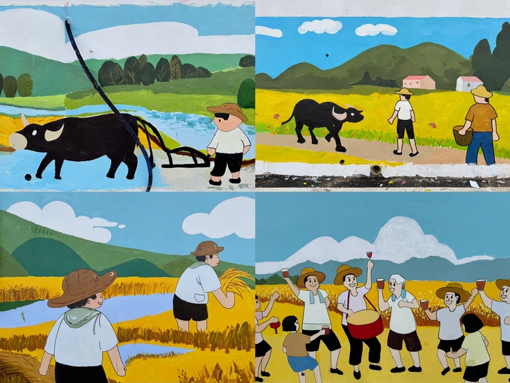 针对当地稻虾共作特色产业,杨芳老师带领学生们创作了《二十四节气图》,其中《夏至》《秋分》两幅墙绘极具代表性画面中,农户们在田间劳作,水田插秧稻穗金黄、虾肥鱼跃,细腻生动呈现在墙面上。村民们驻足观赏,感慨不已,“这些画把农忙生活变成了咱能看懂的画面,党的好政策就像这稻穗一样,在我们这里结满了幸福